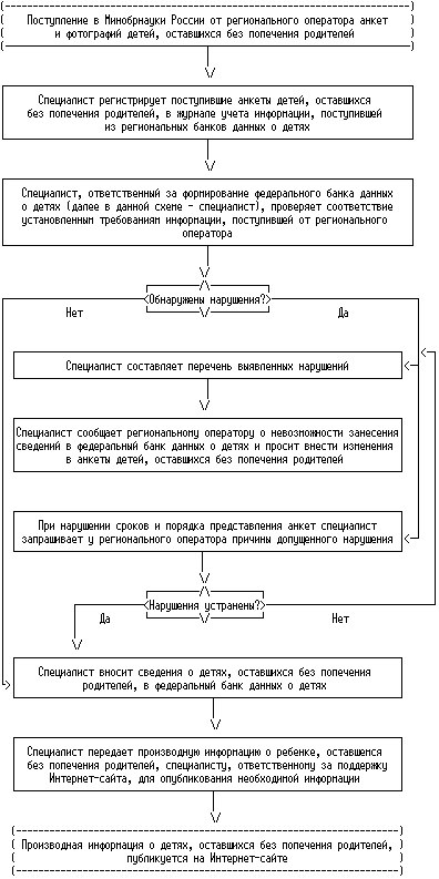 Сведения о детях, оставшихся без попечения родителей, вносятся в федеральный банк данных о детях в день поступления анкет детей, оставшихся без попечения родителей, соответствующих требованиям, установленным пунктом 15.3 настоящего Регламента, специалистом, ответственным за формирование федерального банка данных о детях.