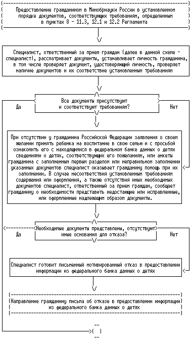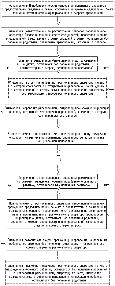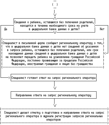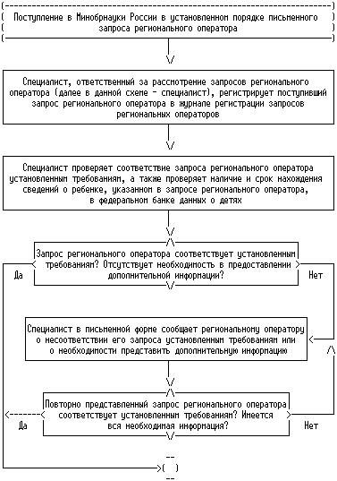 БЛОК-СХЕМА ПОСЛЕДОВАТЕЛЬНОСТИ ДЕЙСТВИЙ ПРИ ИСПОЛНЕНИИ АДМИНИСТРАТИВНОЙ ПРОЦЕДУРЫ ПО РАССМОТРЕНИЮ ЗАПРОСОВ РЕГИОНАЛЬНЫХ ОПЕРАТОРОВ О ПРЕДОСТАВЛЕНИИ СВЕДЕНИЙ О ДЕТЯХ, СОСТОЯЩИХ НА УЧЕТЕ В ФЕДЕРАЛЬНОМ БАНКЕ ДАННЫХ О ДЕТЯХ И ОТВЕЧАЮЩИХ ТРЕБОВАНИЯМ, УКАЗАННЫМ В ЗАПРОСЕ