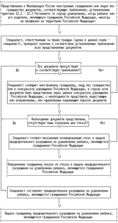 Предварительное разрешение на усыновление ребенка, гражданина Российской Федерации, в случае, если указанный ребенок или его родители, являющиеся гражданами Российской Федерации, никогда не проживали на территории Российской Федерации, выдается в течение 20 рабочих дней со дня подачи иностранным гражданином или лицом без гражданства документов, соответствующих требованиям, установленным пунктами 12.7-12.9 настоящего Регламента.
