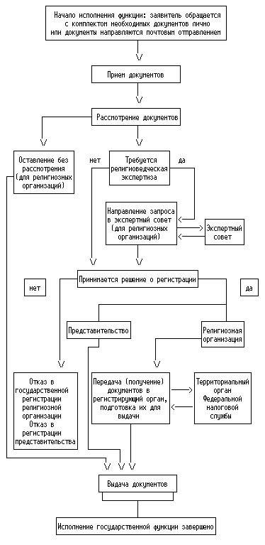 государственная регистрация религиозной организации (принятие решения о государственной регистрации; направление в порядке, установленном законодательством Российской Федерации, документов в соответствующий регистрирующий орган для внесения записи в Единый государственный реестр юридических лиц; получение документов из регистрирующего органа; внесение сведений о религиозной организации в ведомственный реестр, формирование и выдача документов заявителю);