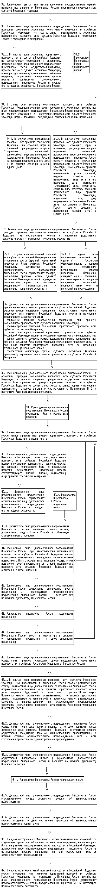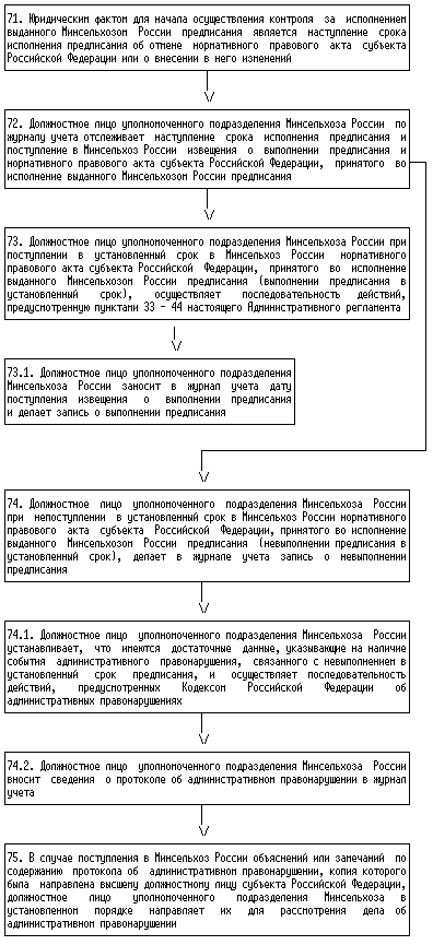 73. Должностное лицо уполномоченного подразделения Минсельхоза России при поступлении в установленный срок в Минсельхоз России нормативного правового акта субъекта Российской Федерации, принятого во исполнение выданного Минсельхозом России предписания (выполнении предписания в установленный срок), осуществляет последовательность действий, предусмотренную пунктами 33 - 44 Административного регламента.
