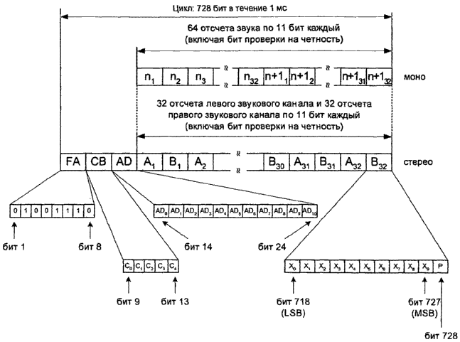 3. Биты, переносящие в цикле информацию о звуковых отсчетах (биты с номерами от 25 по 728 включительно), располагаются в виде матрицы размерности 44 строки x 16 столбцов. Запись битов исходного цифрового пакета производится по колоннам сверху вниз и слева направо. По заполнении всей матрицы осуществляется считывание битов в канал по строкам слева направо и сверху вниз.