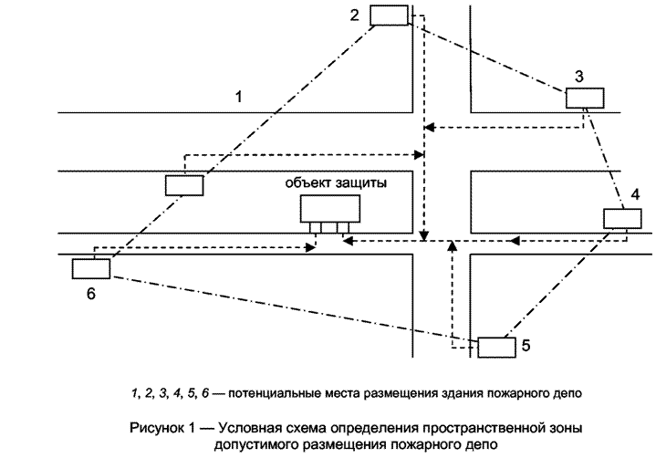 В общем случае максимально допустимое расстояние от объекта предполагаемого пожара до ближайшего пожарного депо следует определять по уличной сети дорог населенного пункта или производственного объекта (см. рисунок 1).
