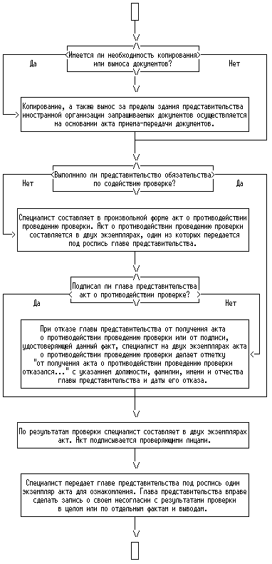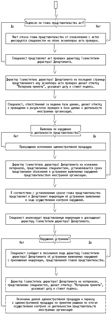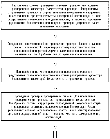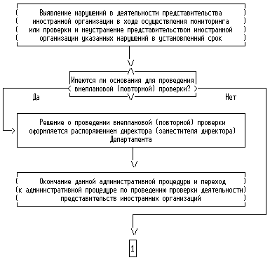 БЛОК-СХЕМА ПОСЛЕДОВАТЕЛЬНОСТИ ДЕЙСТВИЙ ПРИ ИСПОЛНЕНИИ АДМИНИСТРАТИВНОЙ ПРОЦЕДУРЫ ПО ОСУЩЕСТВЛЕНИЮ ПРОВЕРКИ ДЕЯТЕЛЬНОСТИ ПРЕДСТАВИТЕЛЬСТВ ИНОСТРАННЫХ ОРГАНИЗАЦИЙ