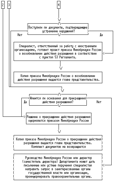 136. При выявлении оснований для прекращения действия разрешений, указанных в пункте 20 настоящего Регламента, специалист, ответственный за работу с иностранными организациями, оформляет приказ Минобрнауки России о прекращении действия разрешения в порядке, установленном пунктом 53 настоящего Регламента.