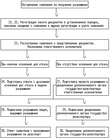 20. Блок-схема исполнения административных процедур, выполняемых при осуществлении государственной функции по рассмотрению документов и принятия решения о выдаче разрешений на реэкспорт (отказе в выдаче разрешения на реэкспорт), приведена в приложении к настоящему Административному регламенту.