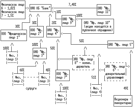 схему взаимосвязей банка и лиц, оказывающих существенное (прямое или косвенное) влияние на решения, принимаемые органами управления банка, с указанием третьих лиц, через которых косвенно оказывается существенное влияние (далее - Схема).