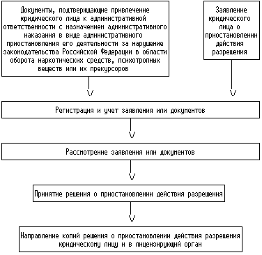 при приостановлении действия разрешения - 15 календарных дней со дня регистрации заявления юридического лица о приостановлении действия разрешения или документов, подтверждающих привлечение юридического лица к административной ответственности с назначением административного наказания в виде административного приостановления его деятельности за нарушение законодательства Российской Федерации в области оборота наркотических средств, психотропных веществ или их прекурсоров (далее - нарушение законодательства);