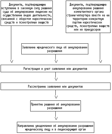 при аннулировании разрешения - 15 календарных дней со дня регистрации заявления юридического лица об аннулировании разрешения либо документов, подтверждающих вступление в законную силу решения суда об аннулировании лицензии на осуществление видов деятельности, связанной с оборотом наркотических средств и психотропных веществ, вынесенного в отношении юридического лица, допустившего нарушение законодательства, или аннулирование разрешения компетентного органа страны-импортера ввезти на ее территорию конкретную партию наркотических средств, психотропных веществ или их прекурсоров.