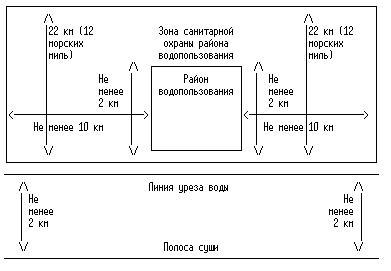 2.3. Зона санитарной охраны района водопользования ограничена в сторону моря границами территориальных морских вод и в обе стороны от района водопользования по линии уреза воды на 10 км. Зоной санитарной охраны для районов водопользования внутренних морей является вся акватория морских вод, за исключением районов водопользования.