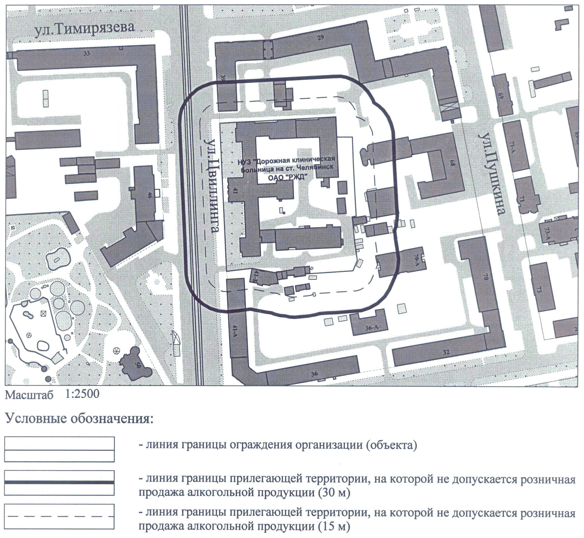 СХЕМА ГРАНИЦ ТЕРРИТОРИИ, НА КОТОРОЙ НЕ ДОПУСКАЕТСЯ РОЗНИЧНАЯ ПРОДАЖА АЛКОГОЛЬНОЙ ПРОДУКЦИИ, ПРИЛЕГАЮЩЕЙ К ПОЛИКЛИНИКЕ НУЗ "ДОРОЖНАЯ КЛИНИЧЕСКАЯ БОЛЬНИЦА НА СТ. ЧЕЛЯБИНСК ОАО "РЖД" ПО АДРЕСУ: Г. ЧЕЛЯБИНСК, СОВЕТСКИЙ РАЙОН, УЛ. ЦВИЛЛИНГА, 41