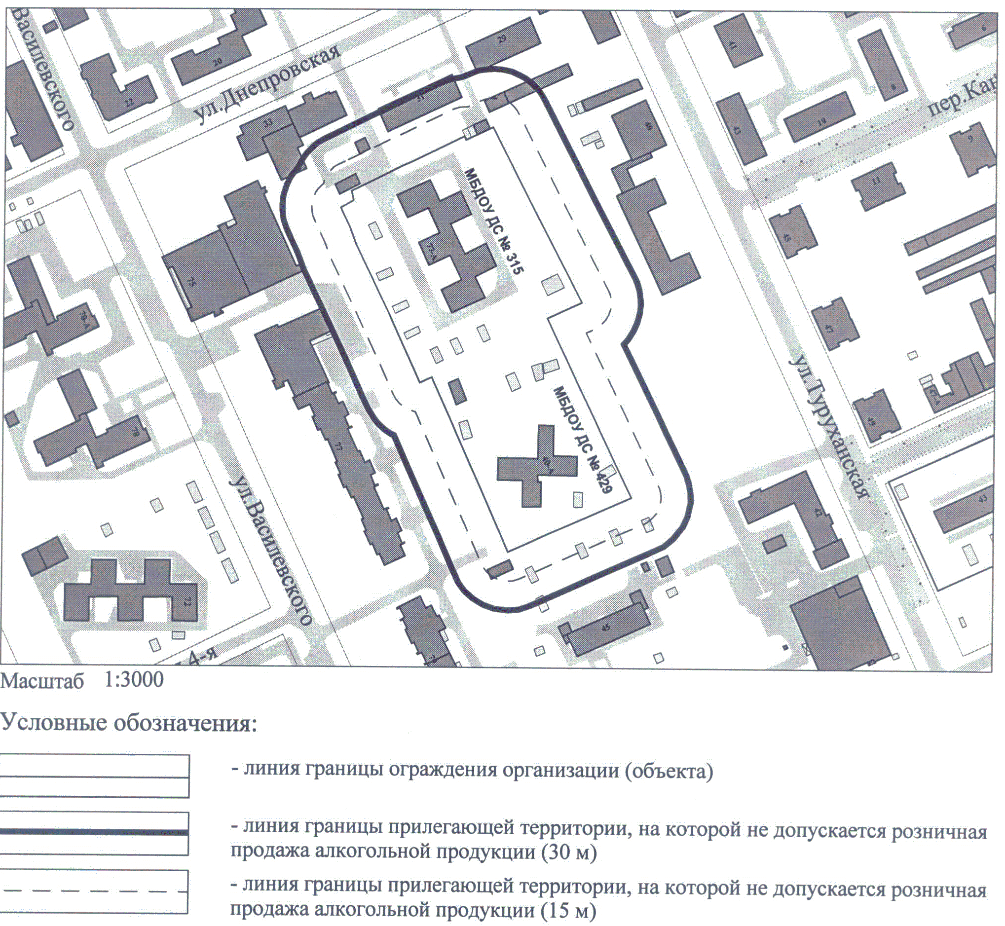 СХЕМА ГРАНИЦ ТЕРРИТОРИИ, НА КОТОРОЙ НЕ ДОПУСКАЕТСЯ РОЗНИЧНАЯ ПРОДАЖА АЛКОГОЛЬНОЙ ПРОДУКЦИИ, ПРИЛЕГАЮЩЕЙ К МБДОУ ДС N 315 И МБДОУ ДС N 429 ПО АДРЕСУ: Г. ЧЕЛЯБИНСК, ЛЕНИНСКИЙ РАЙОН, УЛ. ВАСИЛЕВСКОГО, 77-А, УЛ. ТУРУХАНСКАЯ, 40-А