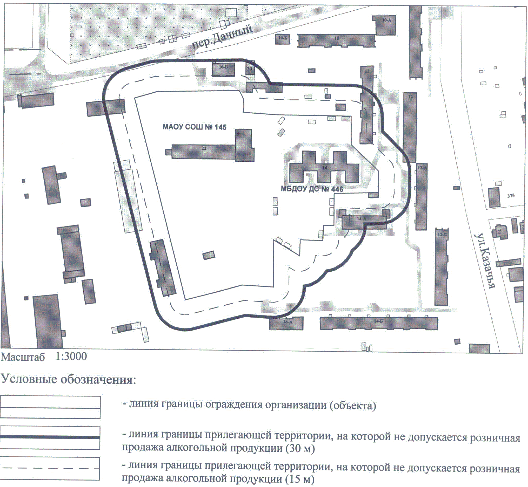 СХЕМА ГРАНИЦ ТЕРРИТОРИИ, НА КОТОРОЙ НЕ ДОПУСКАЕТСЯ РОЗНИЧНАЯ ПРОДАЖА АЛКОГОЛЬНОЙ ПРОДУКЦИИ, ПРИЛЕГАЮЩЕЙ К МАОУ СОШ N 145 И МБДОУ ДС N 446 ПО АДРЕСУ: Г. ЧЕЛЯБИНСК, СОВЕТСКИЙ РАЙОН, ПЕР. ДАЧНЫЙ, 22, ПЕР. ДАЧНЫЙ, 14