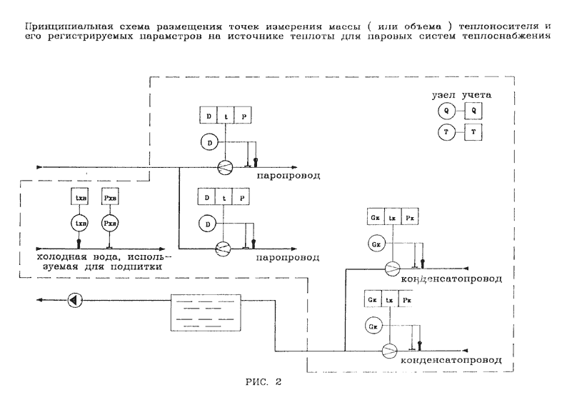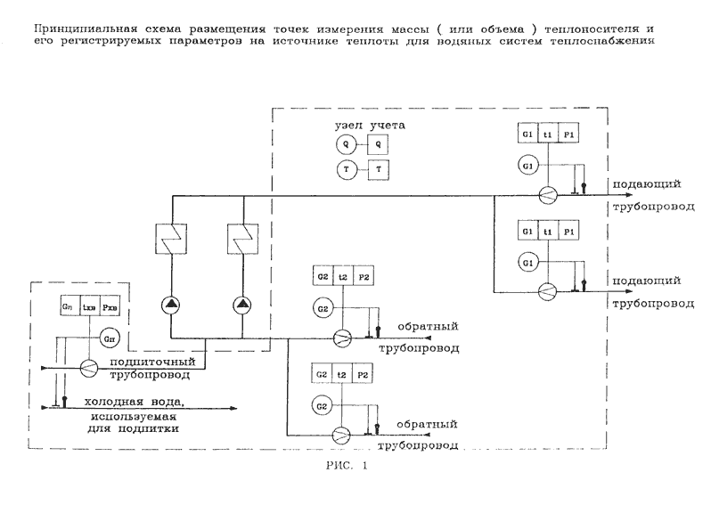 Принципиальная схема размещения точек измерения массы (или объема) теплоносителя, состав измеряемых и регистрируемых параметров приведены на рис. 1