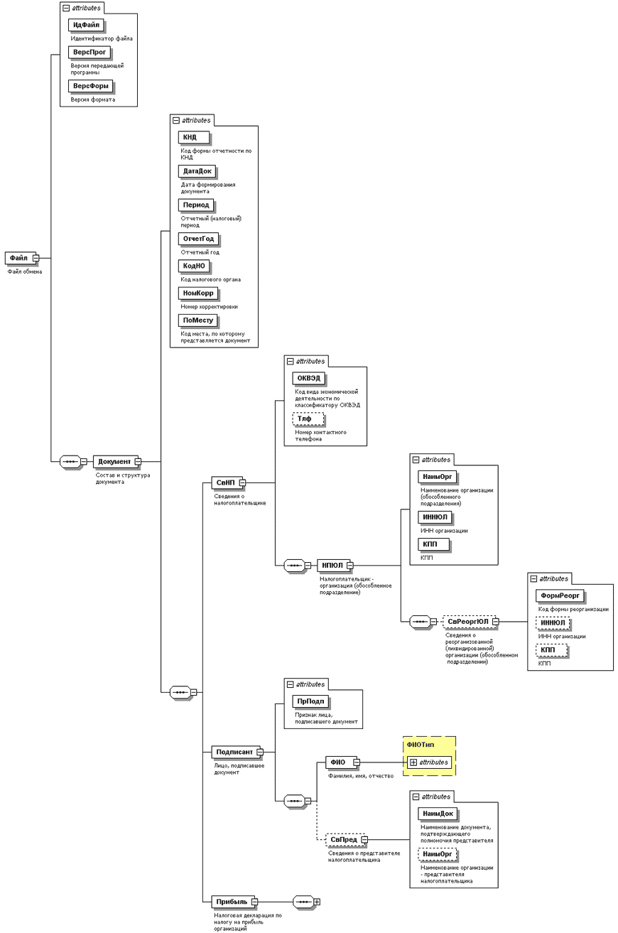 4. Логическая модель файла обмена представлена в виде диаграмм структуры файла обмена на рисунке 1 и структуры элемента "Налоговая декларация по налогу на прибыль организаций (Прибыль)" на рисунке 2 настоящего Формата. Элементами логической модели файла обмена являются элементы и атрибуты XML файла. Перечень структурных элементов логической модели файла обмена и сведения о них приведены в таблицах 4.1 - 4.59 настоящего Формата.