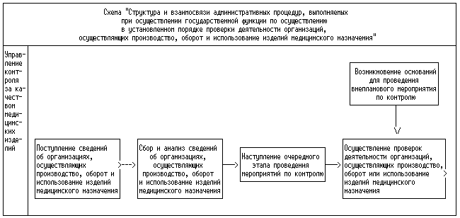15. Структура и взаимосвязи административных процедур, выполняемых при исполнении государственной функции по осуществлению в установленном порядке проверки деятельности организаций, осуществляющих производство, оборот и использование изделий медицинского назначения, приведены на схеме, предусмотренной Приложение 2 к Административному регламенту.