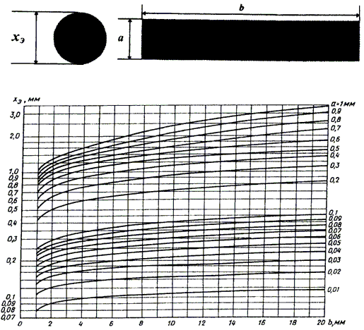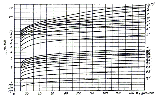 Преобразование полученного по номограмме эквивалентного размера из угловых размеров (угловых минут) в линейные (миллиметры) осуществляется по формуле