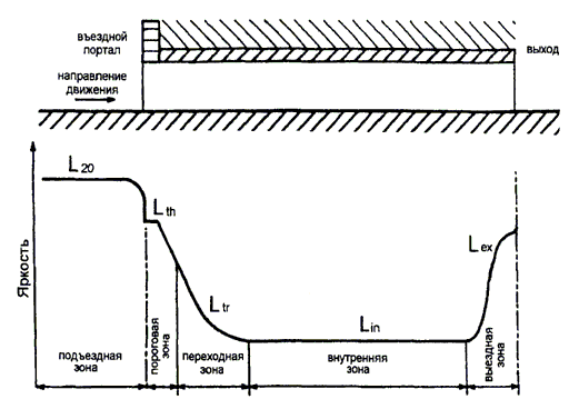Ж.1. В дневном режиме для облегчения зрительной адаптации водителей должен быть обеспечен плавный переход от естественного освещения при въезде в тоннель к существенно более низкому искусственному освещению основной части тоннеля, а также обратный переход при выезде из него. С этой целью в тоннеле выделяют четыре яркостные зоны: пороговую переходную, внутреннюю и выездную, а перед въездным порталом - подъездную зону в соответствии с рисунком Ж.1. Яркостный режим и длину каждой зоны назначают с учетом проектной скорости и интенсивности движения транспорта, длины тоннеля, его кривизны в плане и профиле, ориентации въездного портала относительно сторон света и условий его обзора.