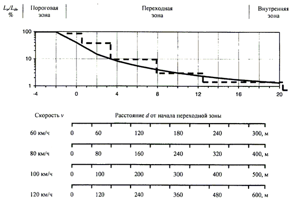 Рисунок Ж.3. Кривая спада яркости дорожного покрытия в переходной зоне