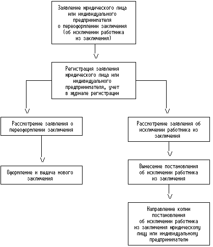 БЛОК-СХЕМА ПОСЛЕДОВАТЕЛЬНОСТИ АДМИНИСТРАТИВНЫХ ДЕЙСТВИЙ ПРИ ПЕРЕОФОРМЛЕНИИ ЗАКЛЮЧЕНИЯ (ИСКЛЮЧЕНИИ РАБОТНИКА ИЗ ЗАКЛЮЧЕНИЯ)