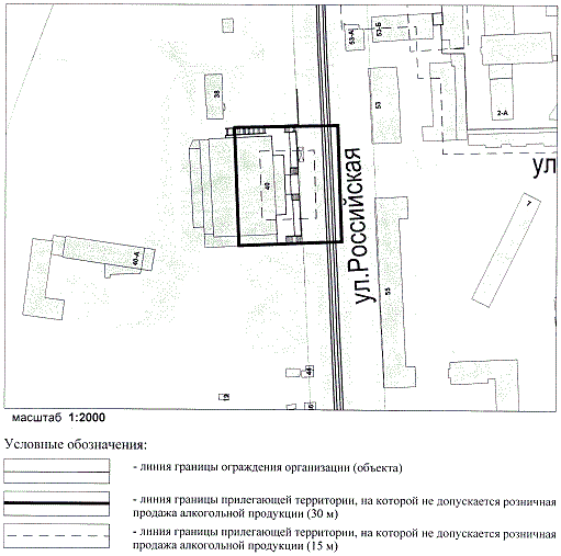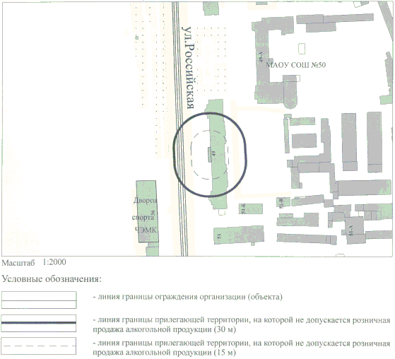 СХЕМА ГРАНИЦ ТЕРРИТОРИИ, НА КОТОРОЙ НЕ ДОПУСКАЕТСЯ РОЗНИЧНАЯ ПРОДАЖА АЛКОГОЛЬНОЙ ПРОДУКЦИИ, ПРИЛЕГАЮЩЕЙ К ООО "ДОМИНАНТА" ПО АДРЕСУ: Г. ЧЕЛЯБИНСК, КАЛИНИНСКИЙ РАЙОН, УЛ. РОССИЙСКАЯ, 49 (НЕЖИЛОЕ ПОМЕЩЕНИЕ N 1)