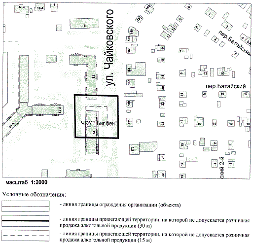 СХЕМА ГРАНИЦ ТЕРРИТОРИИ, НА КОТОРОЙ НЕ ДОПУСКАЕТСЯ РОЗНИЧНАЯ ПРОДАЖА АЛКОГОЛЬНОЙ ПРОДУКЦИИ, ПРИЛЕГАЮЩЕЙ К ЧОУ "БИГ БЕН", ПО АДРЕСУ: Г. ЧЕЛЯБИНСК, КАЛИНИНСКИЙ РАЙОН, УЛ. ЧАЙКОВСКОГО, 54, ОФИС N 6