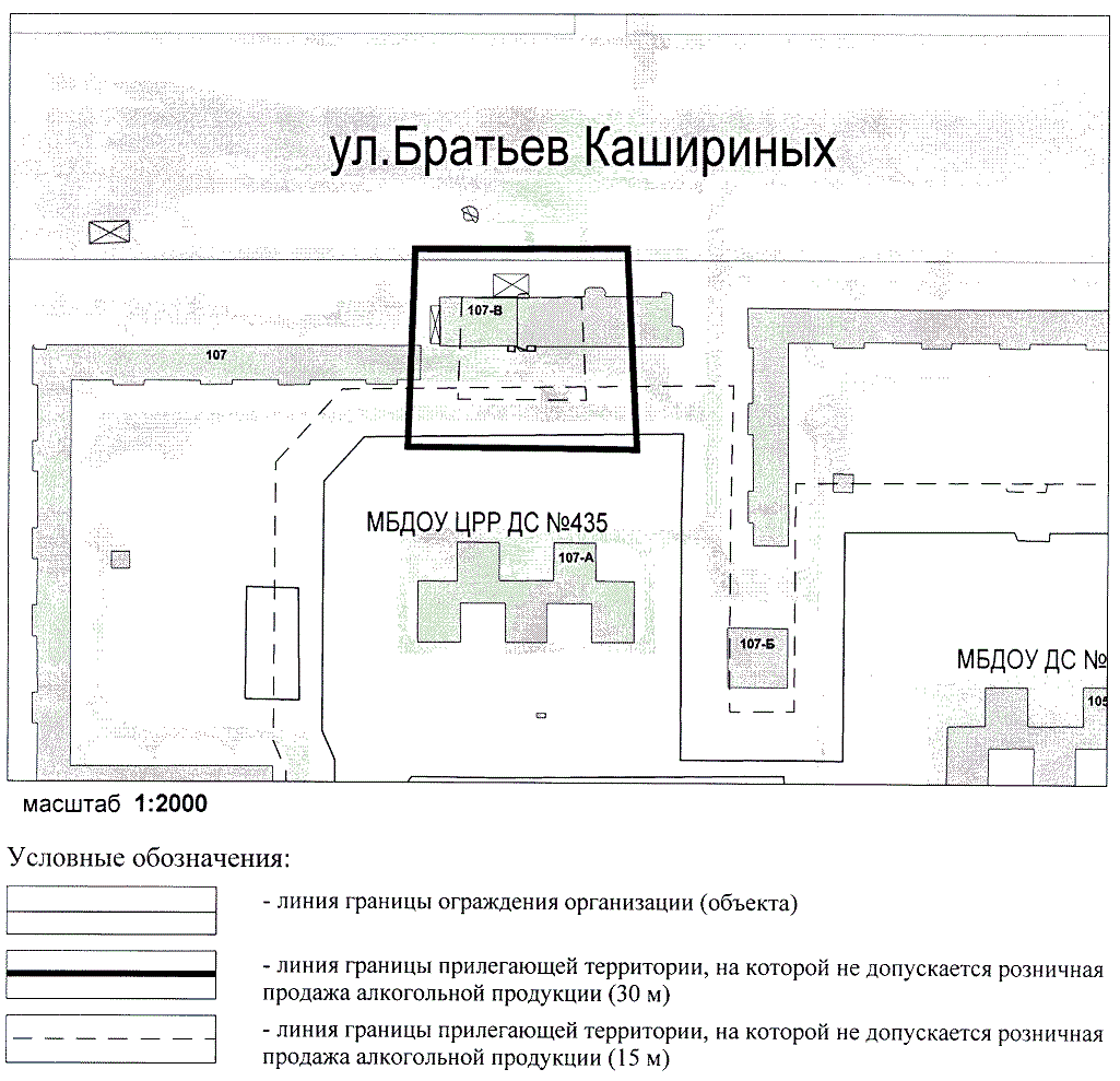 СХЕМА ГРАНИЦ ТЕРРИТОРИИ, НА КОТОРОЙ НЕ ДОПУСКАЕТСЯ РОЗНИЧНАЯ ПРОДАЖА АЛКОГОЛЬНОЙ ПРОДУКЦИИ, ПРИЛЕГАЮЩЕЙ К МБДОУ ДС N 57, МБДОУ ЦРР ДС N 435, МБОУ СОШ N 87, МБОУ ЦПМСС, АВТОШКОЛА, ПО АДРЕСУ: Г. ЧЕЛЯБИНСК, КАЛИНИНСКИЙ РАЙОН, УЛ. БРАТЬЕВ КАШИРИНЫХ, 105-Б, 107-А, УЛ. МОЛОДОГВАРДЕЙЦЕВ, 61-А