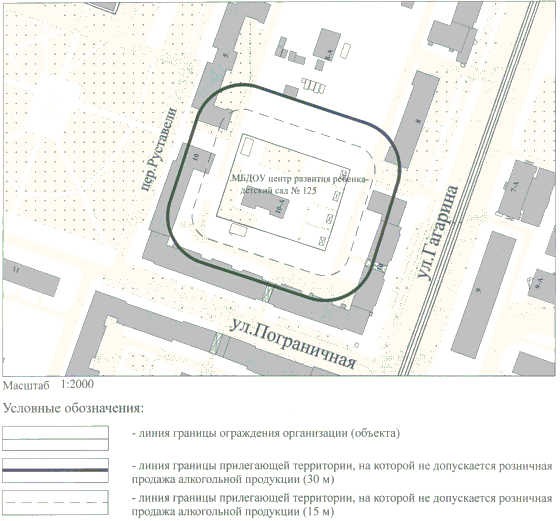 СХЕМА ГРАНИЦ ТЕРРИТОРИИ, НА КОТОРОЙ НЕ ДОПУСКАЕТСЯ РОЗНИЧНАЯ ПРОДАЖА АЛКОГОЛЬНОЙ ПРОДУКЦИИ, ПРИЛЕГАЮЩЕЙ К МБДОУ ЦЕНТР РАЗВИТИЯ РЕБЕНКА-ДЕТСКИЙ САД N 125 ПО АДРЕСУ: Г. ЧЕЛЯБИНСК, ЛЕНИНСКИЙ РАЙОН, УЛ. ГАГАРИНА, 10-А