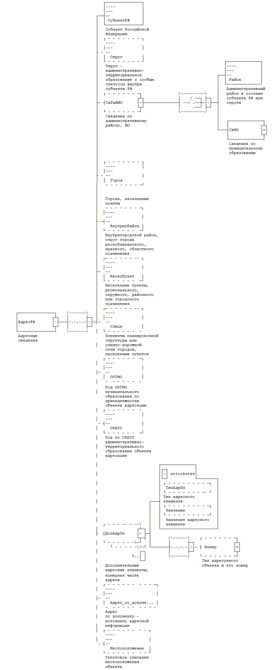 В электронном виде адрес представляется XML-структурой (рис. 1), описывающей совокупность наименований и типов адресообразующих элементов, номера и типы адресуемых объектов, дополнительную информацию, уточняющую адрес объекта адресации. Типы адресообразующих элементов представлены в приложении к Требованиям.