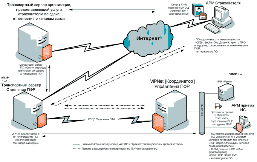 Для передачи данных страхователей через транспортный сервер удостоверяющего центра или организации (далее - Организации, если это не оговорено особо) в территориальный орган ПФР используется технология VipNet, компонент VipNet[Клиент] "Деловая почта" или другие программы, разрешенные к использованию в ПФР. "Деловая почта" и другие программы, разрешенные к использованию в ПФР, обеспечивают передачу файлов между транспортным сервером Организацией и и территориальным органом ПФР. (в ред. Распоряжения Правления ПФ РФ от 10.06.2009 N 116р)