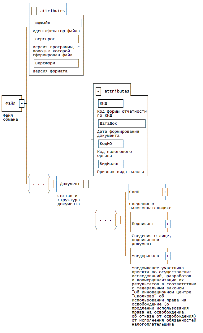 | Уведомление участника проекта по осуществлению исследований, разработок и коммерциализации их результатов в соответствии с Федеральным законом "Об инновационном центре "Сколково" об использовании права на освобождение (о продлении использования права на освобождение, об отказе от освобождения) от исполнения обязанностей налогоплательщика | УведПравОсв | С | О | Состав элемента представлен в табл. 4.7 |
