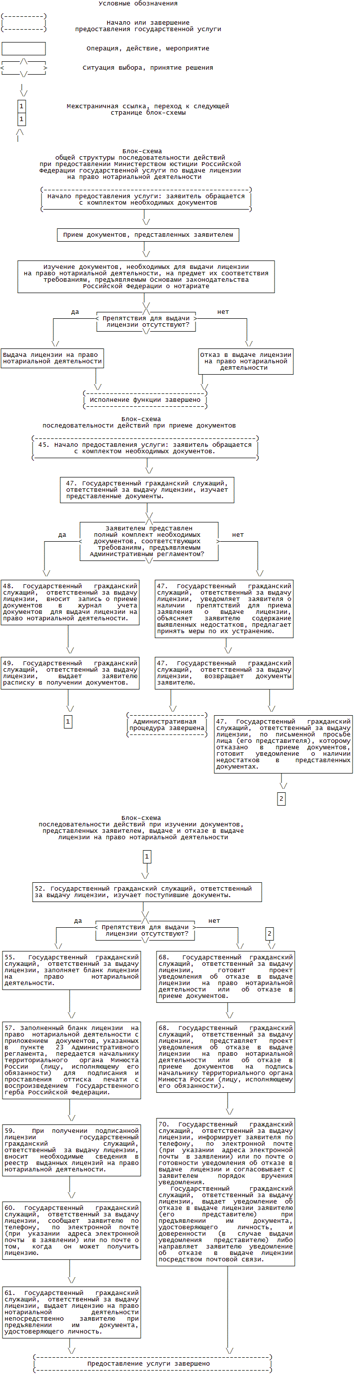 БЛОК-СХЕМА ПОСЛЕДОВАТЕЛЬНОСТИ ДЕЙСТВИЙ ПРИ ПРЕДОСТАВЛЕНИИ МИНИСТЕРСТВОМ ЮСТИЦИИ РОССИЙСКОЙ ФЕДЕРАЦИИ ГОСУДАРСТВЕННОЙ УСЛУГИ ПО ВЫДАЧЕ ЛИЦЕНЗИИ НА ПРАВО НОТАРИАЛЬНОЙ ДЕЯТЕЛЬНОСТИ