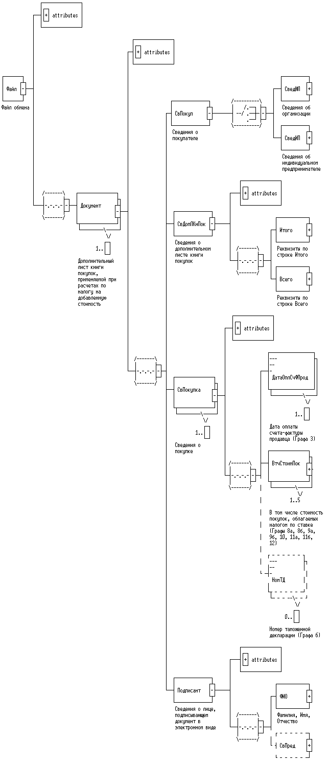 1. Настоящий документ описывает требования к XML файлам (далее - файлам обмена) передачи сведений дополнительного листа книги покупок, применяемой при расчетах по налогу на добавленную стоимость, форма которого утверждена постановлением Правительства Российской Федерации от 26.12.2011 N 1137 "О формах и правилах заполнения (ведения) документов, применяемых при расчетах по налогу на добавленную стоимость".