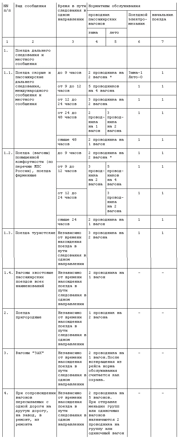 2. Охрана пассажирских вагонов в пунктах формирования и оборота пассажирских поездов в летний период осуществляется по нормативу обслуживания один проводник на группу из четырех вагонов. На зимний период, исходя из местных условий, с учетом низких температур и отсутствия специализированных бригад по экипировке, охране и отоплению вагонов, нормативы обслуживания пассажирских вагонов, находящихся под охраной проводников в пунктах формирования и оборота пассажирских поездов, утверждаются начальником железной дороги с учетом мнения дорпрофсожа. При этом на зимний период нормативы устанавливаются не ниже величин, указанных в настоящих Нормативах обслуживания, в пределах лимитов эксплуатационных затрат и плановой численности. (в ред. Приказа МПС от 29.01.2003 г. N 5)
