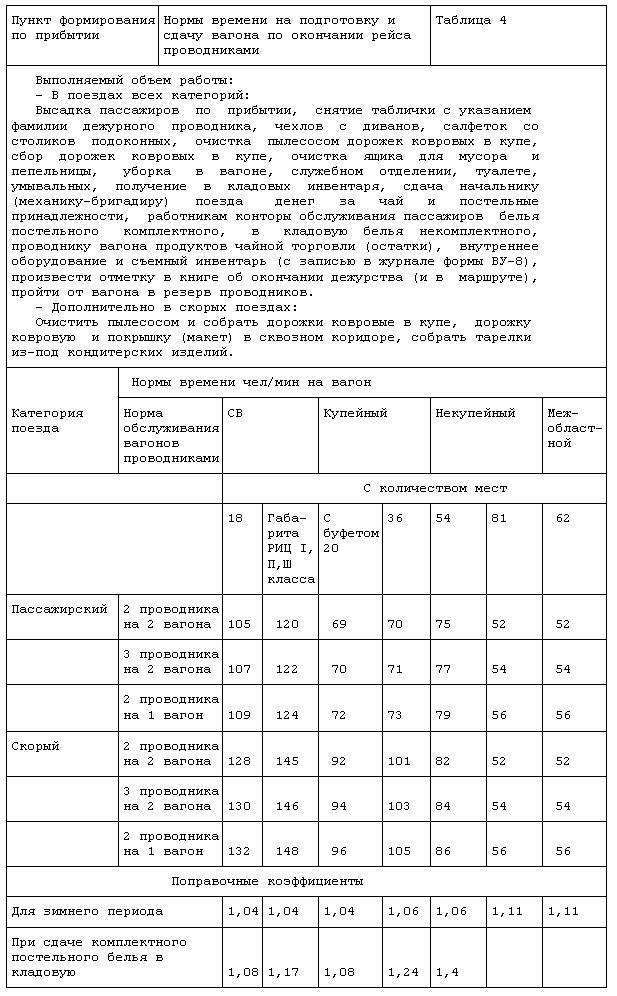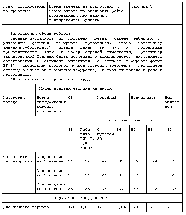 3. Нормативы времени на проходы проводников от резерва к вагону и обратно, а также в кладовую для сдачи и получения белья съемного инвентаря, продуктов чайной торговли могут корректироваться в зависимости от расстояния между резервом проводников и вагоном, а также вагоном и кладовой.