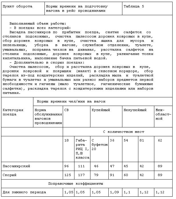 1. Конкретные нормы времени на подготовку вагонов в рейс устанавливаются в соответствии с действующими типовыми нормами времени на подготовку в рейс и обслуживание проводниками в пути следования пассажирских вагонов, а также применительно к технологическим процессам и организации труда в зависимости от местных условий.