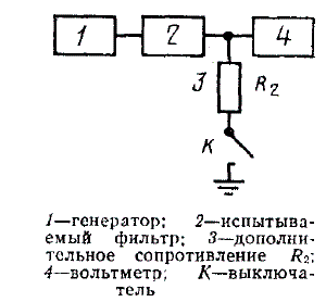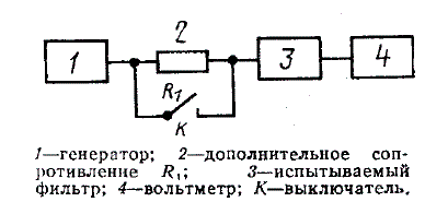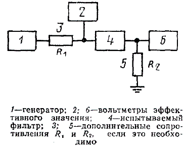 2.2. Подключение фильтра при испытаниях к источнику напряжения и к вольтметру должно проводиться непосредственно при соблюдении условий пп. 1.11; 1.12; 1.13 или через дополнительные сопротивления, выполненные в виде активных резисторов.