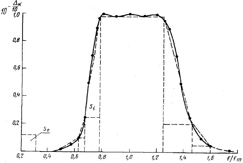 Значение S численно равно эффективной ширине полосы пропускания фильтра b_l. Сравнивая b_l с номинальным значением b_o=0,7071, получаем расхождение = 2,4%, что соответствует требованиям п. 1.10 для фильтра 1-го класса. Значения b_o и b_l приведены на черт. 2.