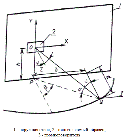7.3.2. Громкоговоритель должен устанавливаться на поверхности земли таким образом, чтобы его ось была направлена в середину наружной ограждающей конструкции, а угол v между осью громкоговорителя и перпендикулярном к плоскости ограждающей конструкции составлял 45°. Допускается проведение измерений также и при углах 0, 15, 30, 60 и 75°.