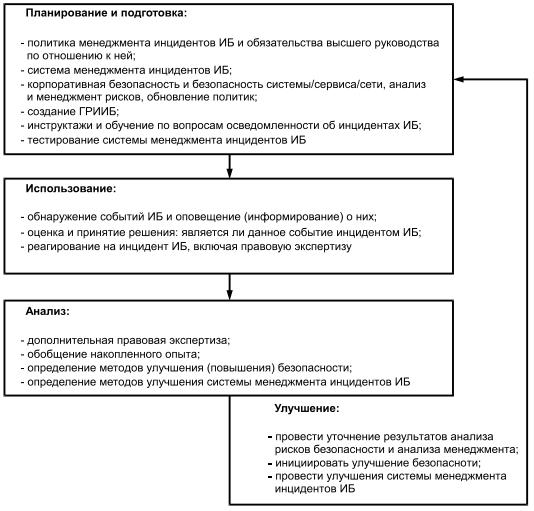 Для достижения целей в соответствии с пунктом 4.1 менеджмент инцидентов ИБ подразделяют на четыре отдельных этапа: