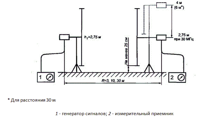 Схема измерений приведена на рисунках Г.1 и Г.2. Генератор сигналов подключают к передающей антенне кабелем определенной длины. Передающую антенну располагают на высоте h_1 (см. таблицы Г.1-Г.3) и выбирают необходимую поляризацию. Если используют настраиваемый диполь, то его настраивают на требуемую частоту.