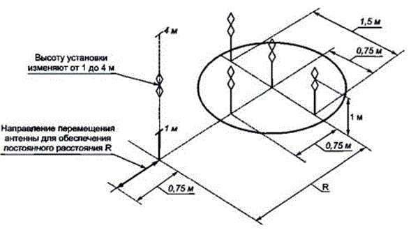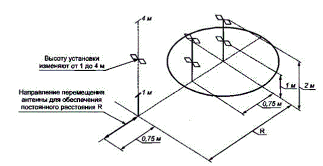 В.9 Приемную антенну монтируют на непроводящей мачте, которая должна обеспечивать подъем антенны от 1 до 4 м при измерительных расстояниях не более 10 м и от 2 до 6 м при расстояниях более 10 м. Все участки антенных кабелей должны быть ортогональны продольным осям элементов антенн, а расстояние между задней кромкой антенны и вертикальным снижением кабеля должно быть не менее 1 м.