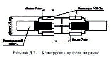 Рамочные антенны выполнены из коаксиального кабеля, имеющего волновое сопротивление 50 Ом. Каждая рамка имеет токосъемник и две прорези. Вносимое в рамку сопротивление токосъемника должно быть как минимум в 2 раза меньше, чем полное сопротивление рамки на частоте 9 кГц. Токосъемники при помощи коаксиальных кабелей с волновым сопротивлением 50 Ом соединяются с коаксиальным переключателем, к которому подключается измеритель ИРП. Каждый из соединительных кабелей должен быть снабжен ферритовым поглотителем, состоящим из 12 ферритовых колец с магнитной проницаемостью в пределах от 100 до 400. Прорези на каждой рамке расположены напротив друг друга симметрично относительно токосъемника. Их конструкция приведена на рисунке Д.2.