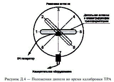 Во время калибровки диполь располагают в плоскости калибруемой рамки. Наведенный ток определяют в восьми положениях диполя (рисунок Д.4). При подаче на диполь сигнала напряжением 1 В величина наведенного в рамках тока должна соответствовать с точностью 1,5 дБ графику, приведенному на рисунке Д.5.