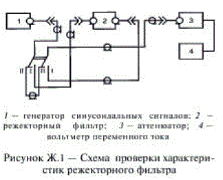 Ж.2 Проверку характеристик фильтров (вносимого затухания и полос режекции) производят в соответствии с рисунком Ж.1.