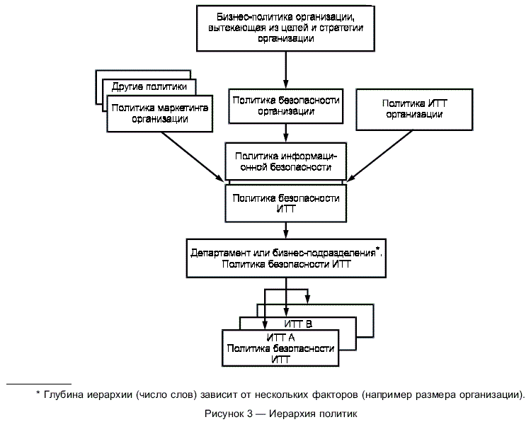 Каждое направление бизнеса организации может также определять уникальные требования безопасности ИТТ. Такие направления должны взаимно поддерживать друг друга: общий процесс безопасности ИТТ должен обеспечивать обмен информацией об аспектах безопасности в целях ее использования для процесса принятия решения руководством.