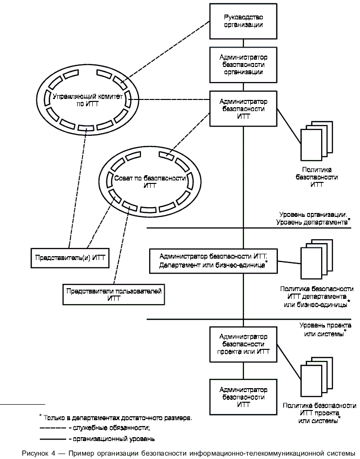 Пример отношений между администратором безопасности ИТТ, советом по безопасности ИТТ и представителями других структур в рамках организации, таких как пользователи и персонал ИТТ, показан на рисунке 4. Эти отношения могут носить управленческий или функциональный характер. В представленном на рисунке 4 примере организации безопасности ИТТ показаны три организационных уровня. Они в целом вытекают из классической организационной структуры, такой как корпорация/департамент или центр/бизнес-подразделение, но могут быть легко адаптированы применительно к любой организации увеличением или уменьшением числа уровней в соответствии с потребностями организации. Малые или средние организации могут возложить на администратора безопасности ИТТ все обязанности, связанные с безопасностью. Когда обязанности объединяются, важно обеспечить сохранение соответствующего контроля и баланса, чтобы избежать концентрации в одних руках слишком большой ответственности без возможности оказывать влияние или осуществлять контроль обязанностей.