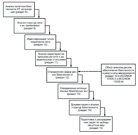 Настоящий стандарт основан на следующем подходе: вначале проводится процесс идентификации и анализа факторов, влияющих на средства связи, в целях установления требований по сетевой безопасности, и затем определяются потенциальные контролируемые зоны. При этом указывается, где можно использовать соответствующие положения других частей ИСО/МЭК 13335.