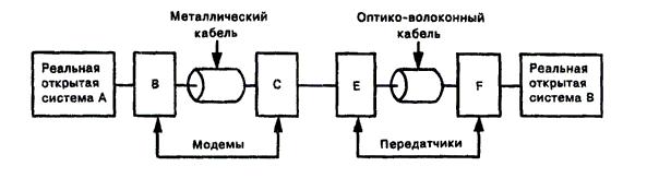 4.2.1. В соответствии с концепцией ВОС реальная система представляет собой компьютер или совокупность нескольких компьютеров, соответствующего программного обеспечения, периферийного оборудования, терминалов, персонала операторов, физических процессов, средств передачи информации и т.д., образующую полностью автономную систему, способную обрабатывать и (или) передавать информацию.