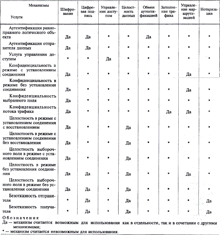 В данном разделе рассмотрены услуги защиты, включенные в архитектуру защиты ВОС, и механизмы, реализующие эти услуги. Описанные ниже услуги защиты являются базовыми услугами защиты. На практике они должны вызываться на соответствующих уровнях и в соответствующих комбинациях, обычно совместно с услугами и механизмами, не входящими в область распространения ВОС, для обеспечения стратегии защиты и/или удовлетворения требований пользователя. Конкретные механизмы защиты могут использоваться для реализации комбинаций базовых услуг защиты. Практические реализации систем могут использовать для прямого привлечения конкретные комбинации базовых услуг защиты.